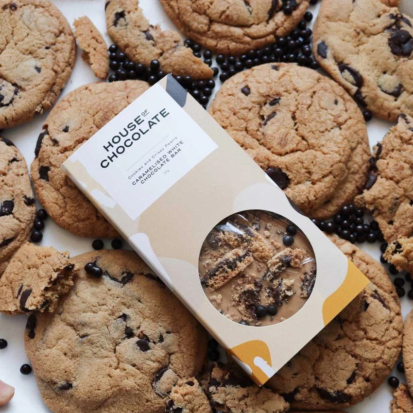 A smooth caramelised white chocolate bar topped with freshly baked chocolate chip cookie pieces and crunchy dark chocolate crispy pearls. Rich and creamy with a playful crunch, it’s a happy twist on a classic chocolate bar.